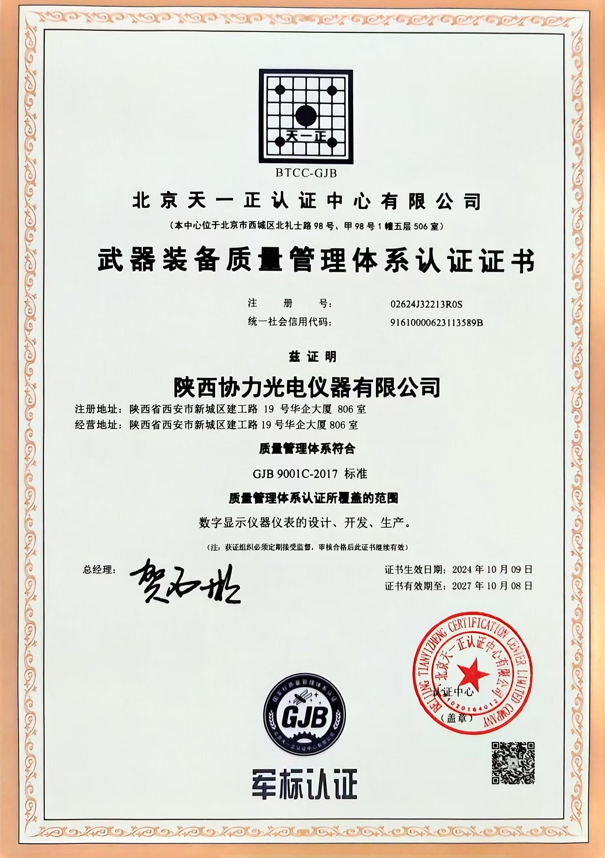 武器裝備質(zhì)量管理體系證書